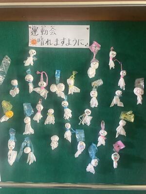 掲示板には手作りのてるてる坊主が飾られています。当日、晴れますように。