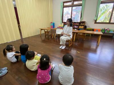 中学3年生の家庭科の授業の一環で、幼稚部におじゃまさせていただき、絵本の読み聞かせを行いました。