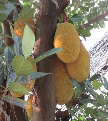 南国の学校らしく、バナナ、グアバ、マンゴーなど、様々な果樹があり、今は、ジャックフルーツが大きな実をつけています。実は、長さ70cm、幅40cm、重さ40-50kgに達するものもあり、子どもたちは、大きさな実を見て「すごーい!」と大興奮です。